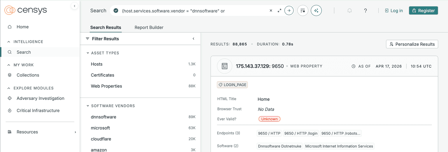 (host.services.software.vendor = "dnnsoftware" or web.software.vendor = "dnnsoftware")). In conclusion, Censys tells us that there should be ~1.3k hosts: