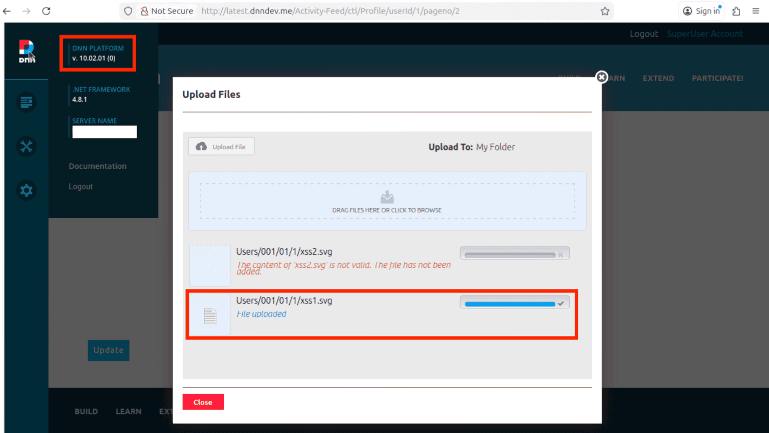 Note 2: If the file doesn’t pass the filters, DNN won't upload it to the server as you’ve seen with “xss2.svg”.