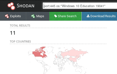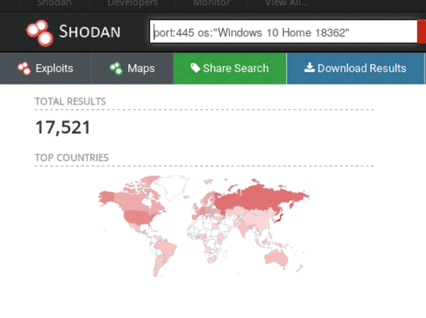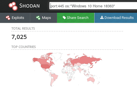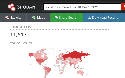 Let’s take a look at Shodan for possible affected devices with SMB protocols exposed to the Internet, which are also running the vulnerable OS versions that we just mentioned.